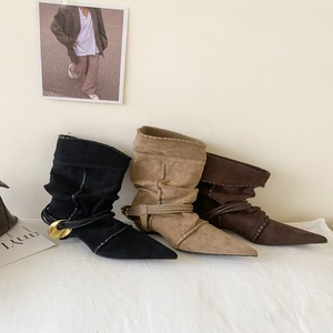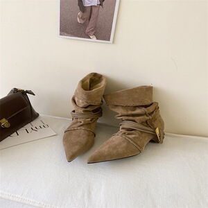 小时髦~复古尖头中筒靴子女靴25年秋冬款麂皮绒细跟短靴~