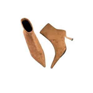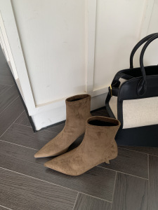 高跟尖头棕色绒面瘦瘦靴短靴女鞋2025新款秋冬季加绒法式小踝靴子