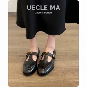 牛皮版~山茶花法式单鞋女平底黑色复古t带玛丽珍鞋圆头通勤小皮鞋