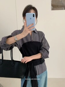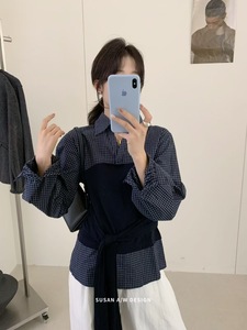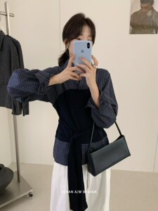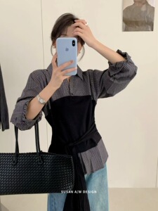 8.22 韩系松弛休闲假两件上衣女2025秋新款格纹显瘦收腰衬衫26878