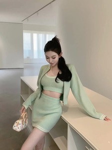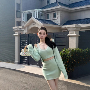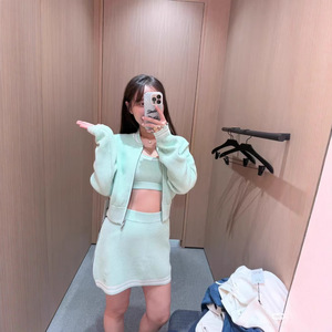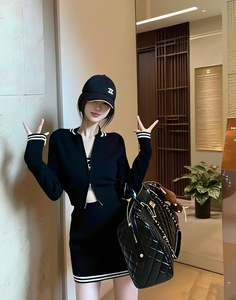 al025秋季 撞色边饰棒球领口拉链针织外套裙子套装