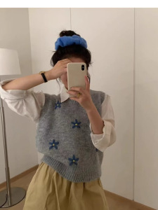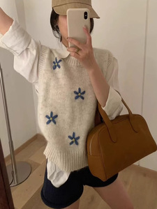 韩系刺绣无袖针织背心马甲女春秋季外搭叠穿圆领毛衣叠穿坎肩马夹