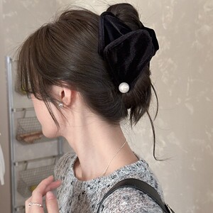 赫本风丝绒缎面仿珍珠鲨鱼夹法式复古小香风气质高级感半扎发抓夹