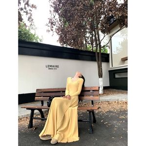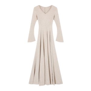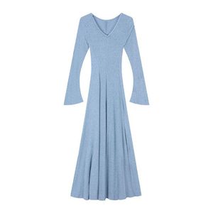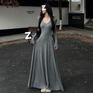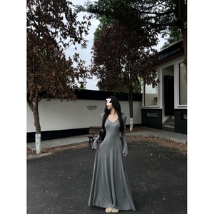 松驰感气质领长袖针织连衣裙女早秋收腰修身打底裙垂感大摆长裙