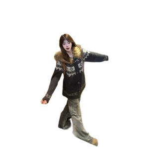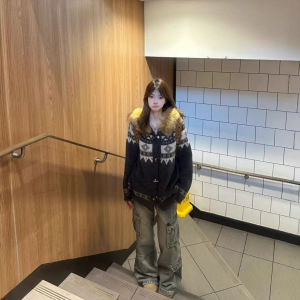 新款秋冬季加厚撞色费尔岛提花可拆卸毛领针织衫设计感毛衣外套冬
