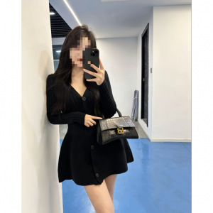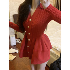 名媛气质红色针织连衣裙女秋冬季甜辣妹收腰显瘦短款蓬蓬a 字裙子