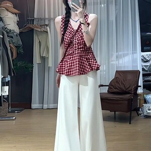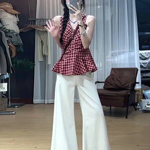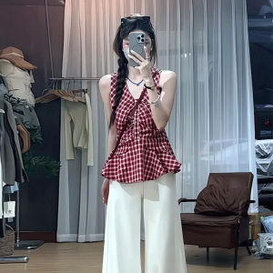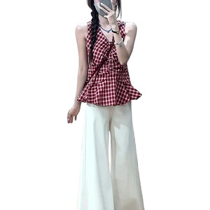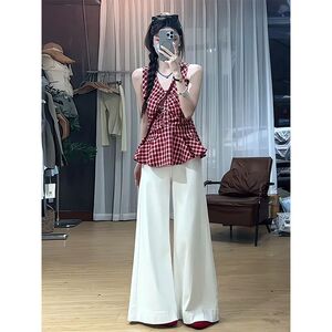 秋季套装女2025新款法式复古红色格纹无袖上衣阔腿裤两件套装