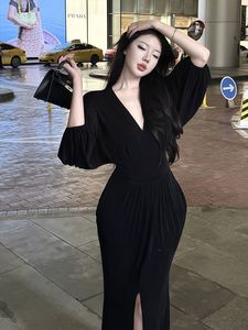 御姐气质v领半袖连衣裙女夏季显瘦收腰休闲裙子黑色开叉包臀长裙