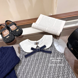 【咸柠七】大牌学院风!女童秋季套装针织开衫娃娃领背心裙两件套