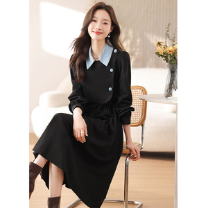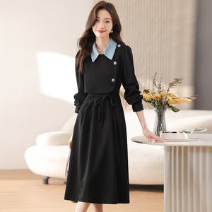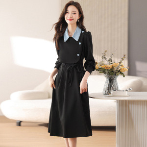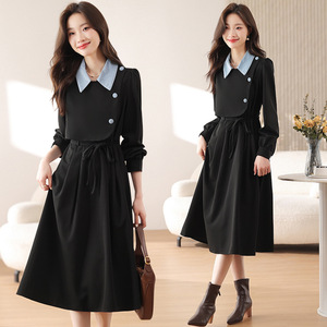 长袖POLO领假两件连衣裙女2025秋装新款蔚蓝夜旅人法式显瘦中长裙