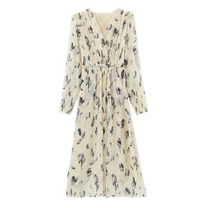 水墨画精致碎花连衣裙女2025秋季法式v字领长袖高级感仙女长裙子