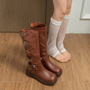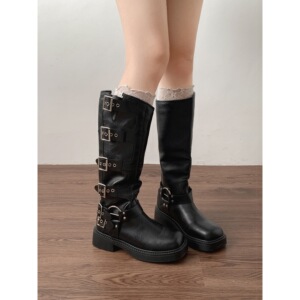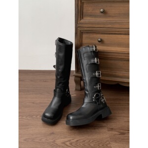 复古黑色英伦风粗跟靴子女长筒靴2025新款秋季小个子增高骑士长靴
