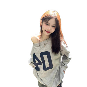 美式辣妹斜肩数字设计感长袖卫衣女2025秋季新款纯欲宽松露肩上衣