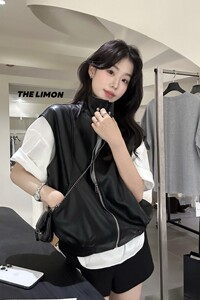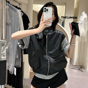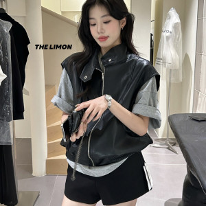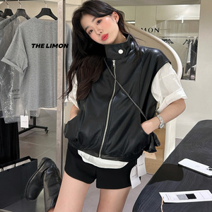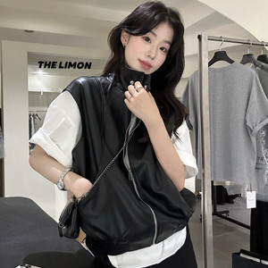 THELIMON柠檬绿茶2025秋季新款高级感立领PU皮皮衣马甲女无袖外套