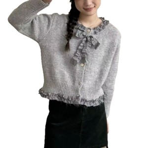 韩系别致木耳边拼接圆领针织开衫女秋季女装设计感蝴蝶结毛衣外套