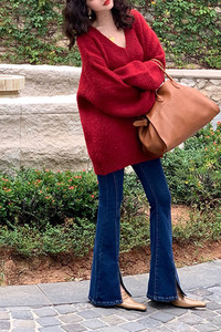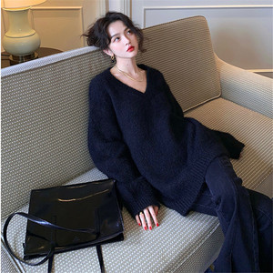 100%羊毛高级感宽松显瘦百搭v领中长款法式毛衣女慵懒风针织大码