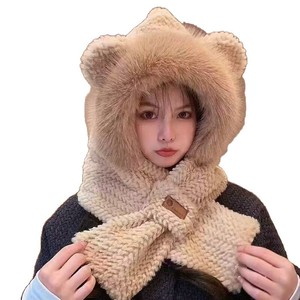 冬季新款日系可爱小熊毛绒帽子围巾手套一体女骑车加厚保暖护耳帽