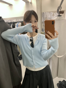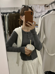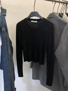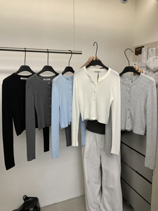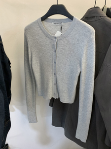 MISS密思家秋季韩系气质显瘦百搭坑条单排扣圆领长袖针织衫女1728