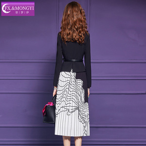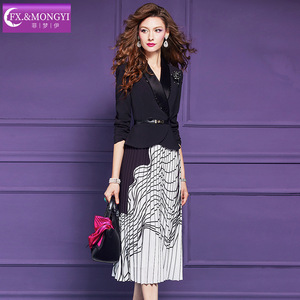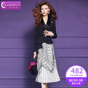 菲梦伊原创钉珠假两件西装连衣裙女秋季设计感收腰印花A字百褶裙