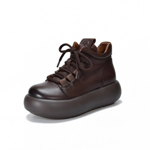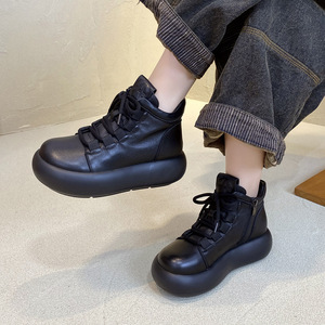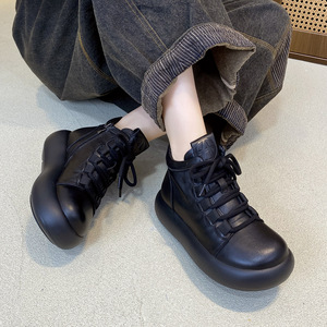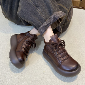 2025秋冬新款头层牛皮复古休闲系带靴子小个子松糕厚底真皮短靴女