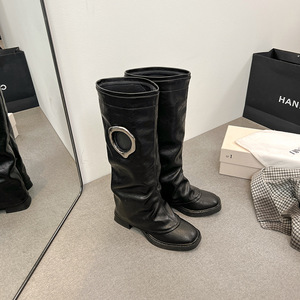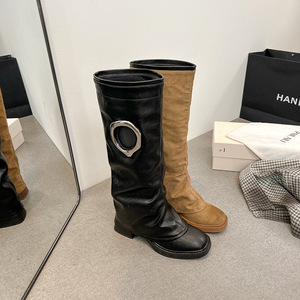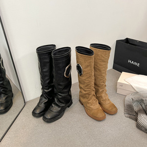 高筒裤管靴子女长筒靴小香风秋冬2025新款黑色粗跟美拉德秋季女靴