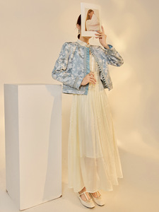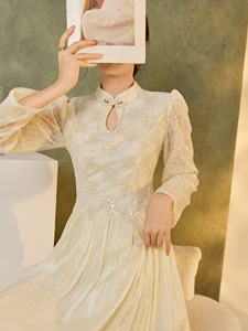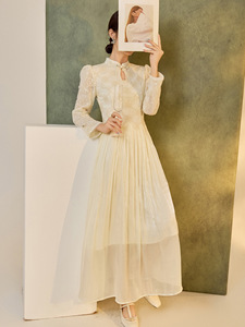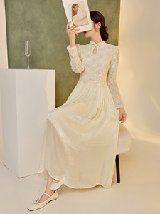 秋季新款甜美拼接刺绣高腰长袖连衣裙新中式高级轻奢仙女裙 N8009