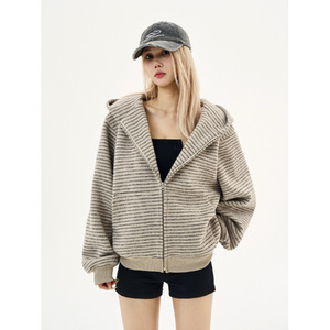 兔绒美式复古2025早秋新款条纹拉链开衫连帽卫衣男女情侣外套