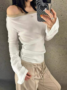 cour法国品牌jennie同款经典刺绣LOGO拼色织带一字肩露肩长袖T恤