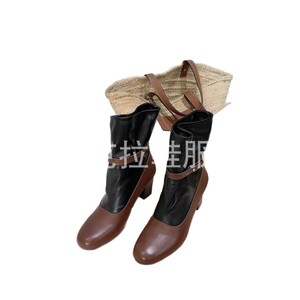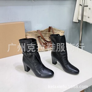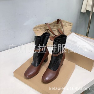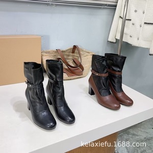 高版小众新款牛皮拼接皮带扣时装靴女圆头粗跟短靴套筒单靴高跟靴