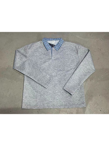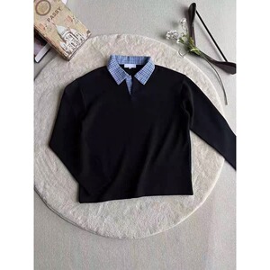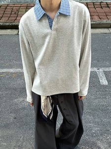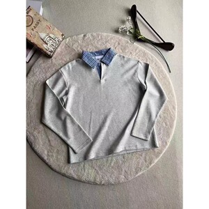 格纹拼接V领灰色卫衣2025正流行美式复古长袖T恤高级感polo衫百搭