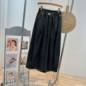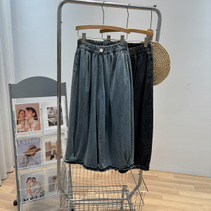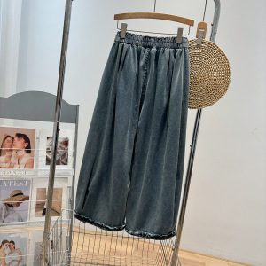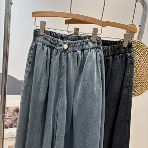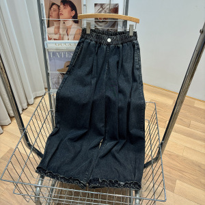 日系设计裤脚木耳边牛仔裤女松紧腰宽松阔腿裤休闲牛仔裤女灯笼裤