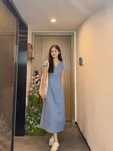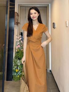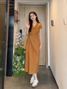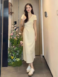收腰显瘦v领连衣裙2025年夏季新款极简风高级感长裙法式裙子女装