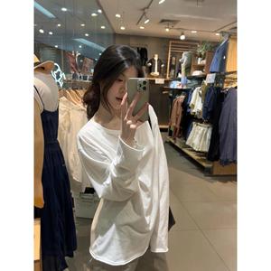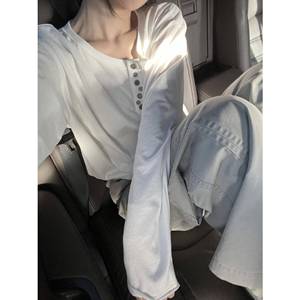 秋季新款韩版宽松显瘦纽扣设计感小众圆领长袖白色T恤女打底上衣