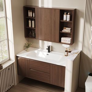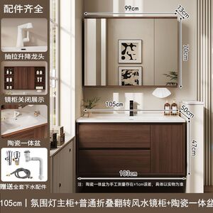 胡桃木丨智能折叠风水镜+人体氛围灯柜-【105CM空间可装】陶瓷一体盆(可切割)
