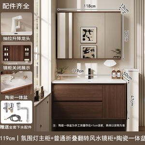 胡桃木丨智能折叠风水镜+人体氛围灯柜-【119CM空间可装】陶瓷一体盆(可切割)