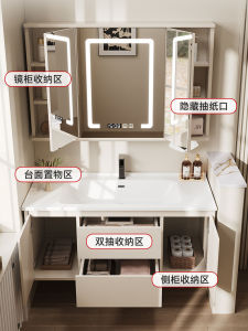 胡桃木丨智能折叠风水镜+人体氛围灯柜-【84CM空间可装】陶瓷一体盆(可切割)