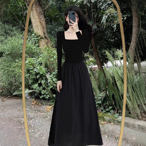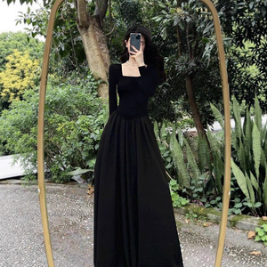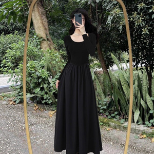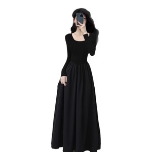 赫本黑色连衣裙女2025春季新款长袖收腰显瘦小黑裙高级感圆领长裙