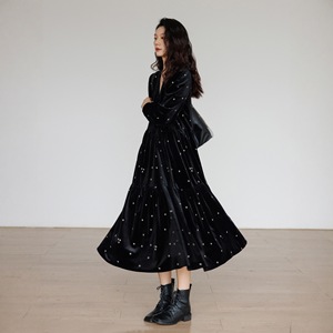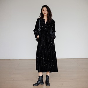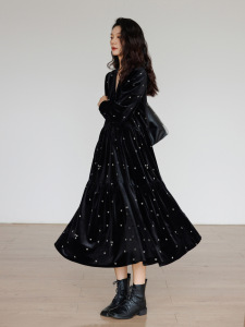 2025新款法式复古丝绒连衣裙V领印花长袖黑色大码宽松中长款气质