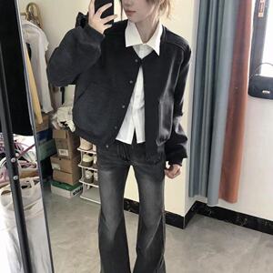 2025跨境秋冬美式棒球服外套女复古宽松短款纯色卡其夹克休闲外套