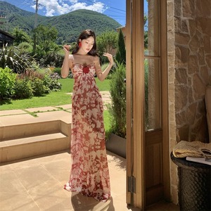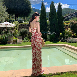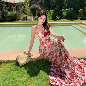 法式立体花朵吊带V领连衣裙泰国海边度假风气质印花长裙