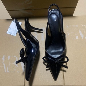 ZA女鞋2025春季新款红色漆皮蝴蝶结尖头高跟一字后空头凉鞋女