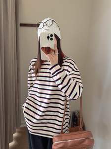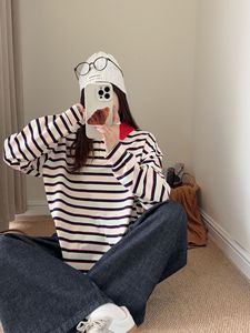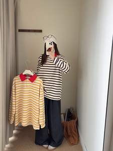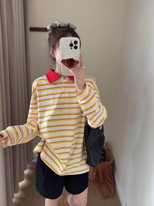 韩代学院风撞色条纹polo领T恤女秋季新款宽松百搭慵懒风长袖上衣