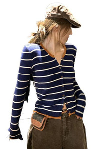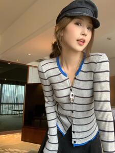 撞色条纹针织开衫女秋季新款韩系穿搭chic修身内搭打底上衣T恤