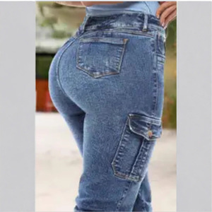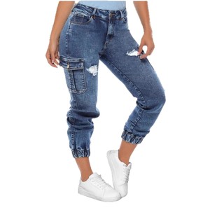 跨境Womenjeans美式破洞弹力紧身橡筋脚口多口袋工装裤修身牛仔裤