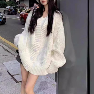 韩版复古麻花针织开衫v领上衣秋冬新款宽松慵懒风软糯毛衣女外套