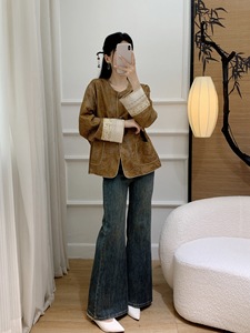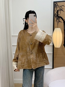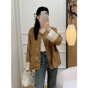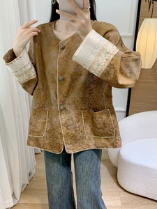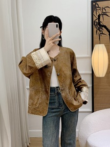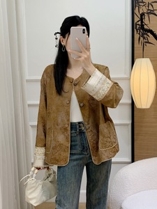 新中式刺绣提花拼接袖外套2025秋季新款复古圆领国风宽松上衣女