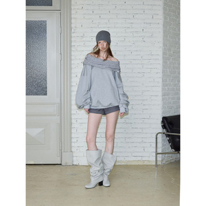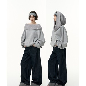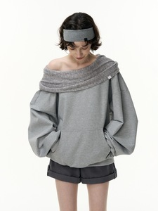 SALTHe盐茶丨【博尔赫斯】斜肩一字领宽松套头连帽卫衣露肩上衣女