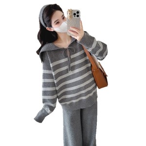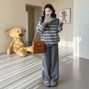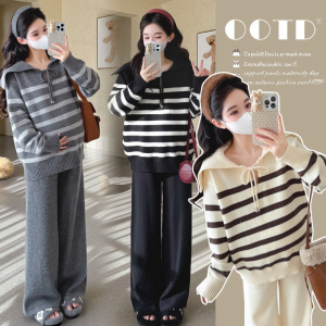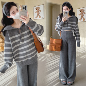 孕妇装潮妈新款秋冬翻领条纹时尚系绳毛衣休闲宽松阔腿裤两件套装