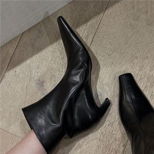 头层牛皮~高级感真皮宽筒高跟短靴女冬方头马丁靴骑士瘦瘦靴踝靴