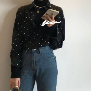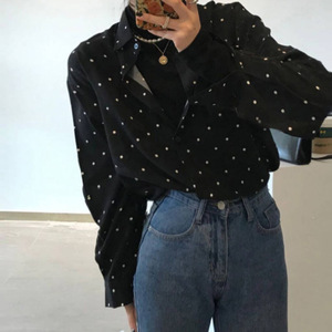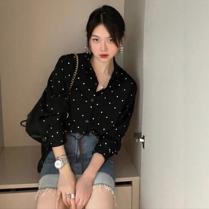 春秋韩国chic复古赫本风翻领撞色波点设计宽松休闲百搭长袖衬衫女